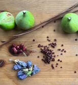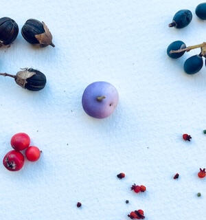 Ink of curry leaf berries, mulberry leaf, lemon verbena, rose hip, pomegranate, plant skeletons found in a street gutter during winter, grief and thread, on paper.