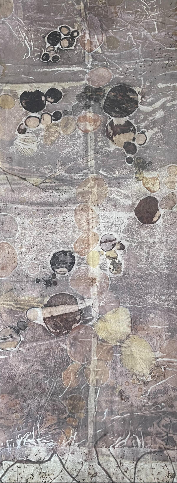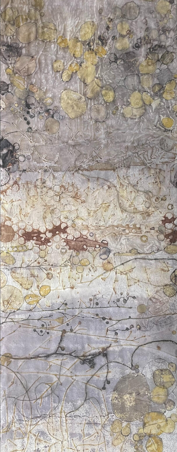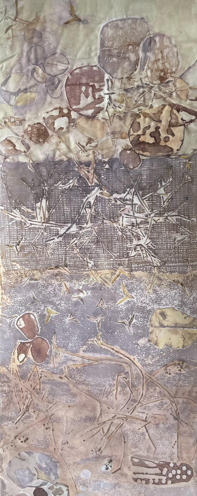 Ecoprinted eucalyptus leaves, bark and plant inks, on paper.